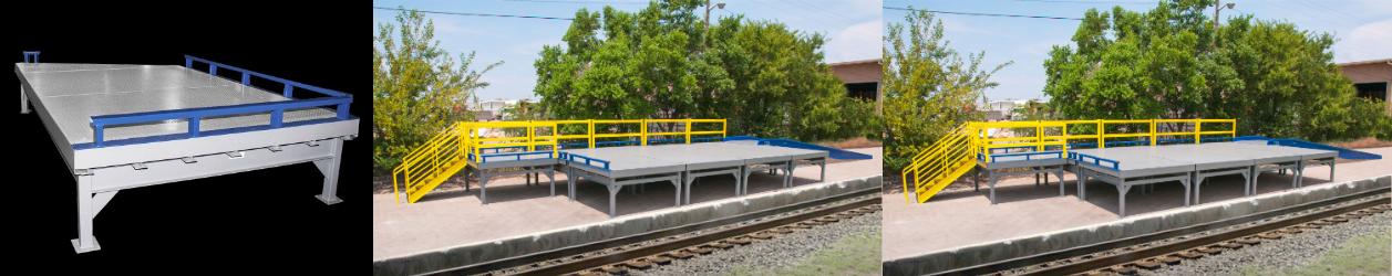 2) Railcar Loading PlatformThis B20SP Series is designed to load and unload railcars. Capacity 20,000 lbs rated. Optionions available are hand rails, run off guards, steps and yard ramp. |