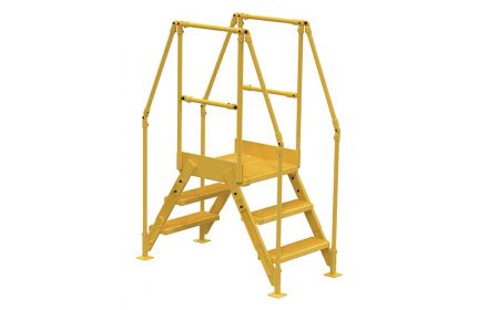 The Crossover Ladder - Crossover Stairs are designed to be mounted as permanent cross-over point over workplace obstructions such as pipes. Units have 3 to 6 steps on each side which are serrated for sure footing and added safety. The top platform has a removable 2-sided 42" high handrail and 21-midrail as well as non-removable 4" toe boards. Step angle is 58 degrees and steps are 7" deep, 23-1/2" wide and 10" high. The ground legs have floor mounting pads and units must be anchored to the floor for use.